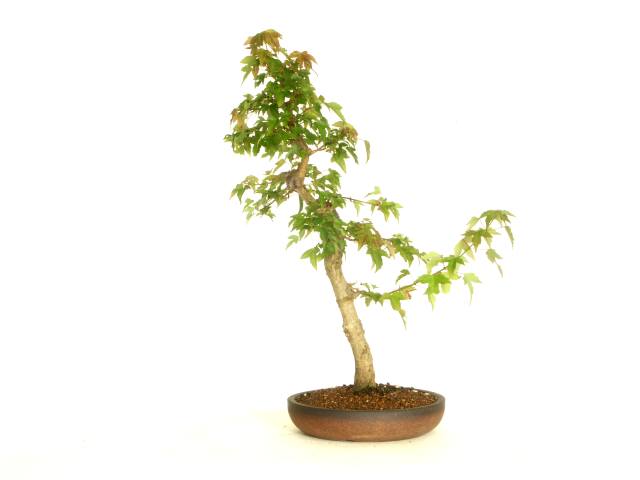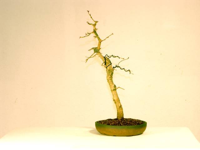 Diesen Ahorn wollte ich eigentlich in einen Wald pflanzen, daher wählte ich einen Baum mit schlankem Stamm und hoch ansetzender Krone. Nach der Grundgestaltung im Frühjahr fiel mir allerdings auf, daß der Baum recht gute Anlagen für die Gestaltung einer geneigte Form hat. Sowohl die Ansätze der Äste am Stamm als auch die gute Stammverjüngung sprachen dafür, aus diesem Baum einen Bonsai zu gestalten und ihn nicht für eine Waldpflanzung zu verwenden. Juli 2004: